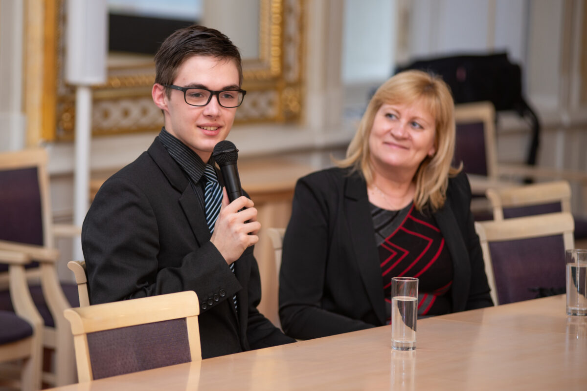 Pak už přišla řada na naše finalisty. S krátkými proslovy vystoupili Kristýna a Matěj. Kristýna mluvila o českém školstvím, které označila za zastaralé. Připomněla, že v rámci základní školní docházky měla individuální režim tzv. domškoláctví, který jí vyhovoval. Následný přechod z domácí výuky do klasické školy však pro ni byl obtížný. „Tam jsem zažila něco jako kulturní šok. Sice jsme mluvili stejnou řečí, ale jinak jsem vůbec nechápala pravidla hry. Po zkušenosti s domškolou, pro mě klasická škola byla spíš peklo, které nemělo žádnou logiku a bylo úplná ztráta času,“ svěřila se Kristýna.